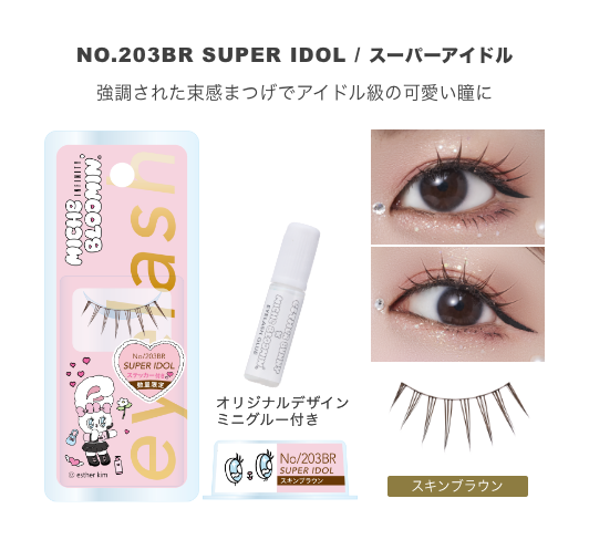 今回のコラボレーションでは、ブランド屈指の人気を誇る束感まつげ「NO.203 SUPER IDOL」と「NO.209 PURE IDOL」をセレクトいたしました 。エスターバニー自身が実際につけまつげを着用して、最高にキュートな“アイドル風”に変身した描き下ろし限定パッケージが登場します。